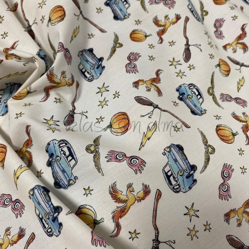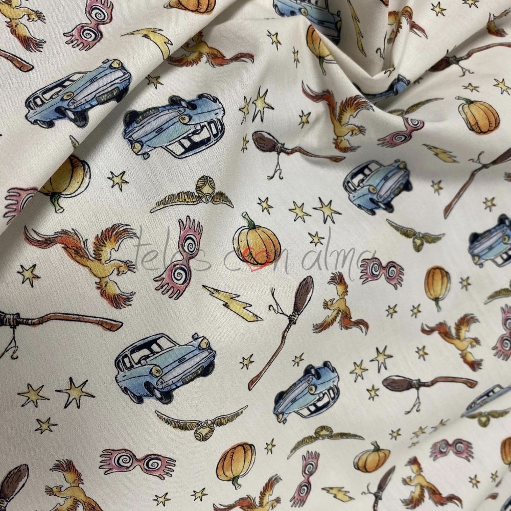 Tela de popelín de algodón 100% con dibujo de Harry Potter, ideal para la confección de mascarillas, gorro sanitario o de cocinero, complementos en ropa, mochilas de cordón, baby o bolsita para el cole...