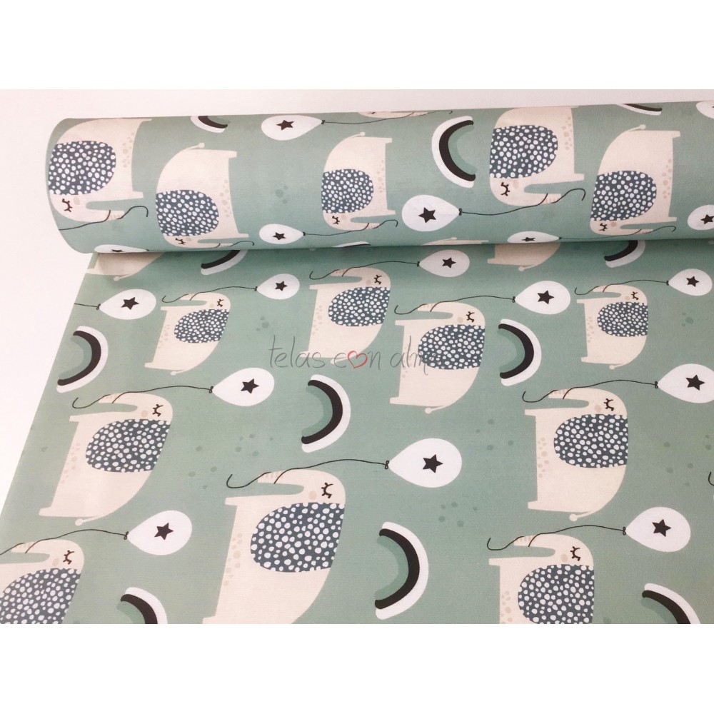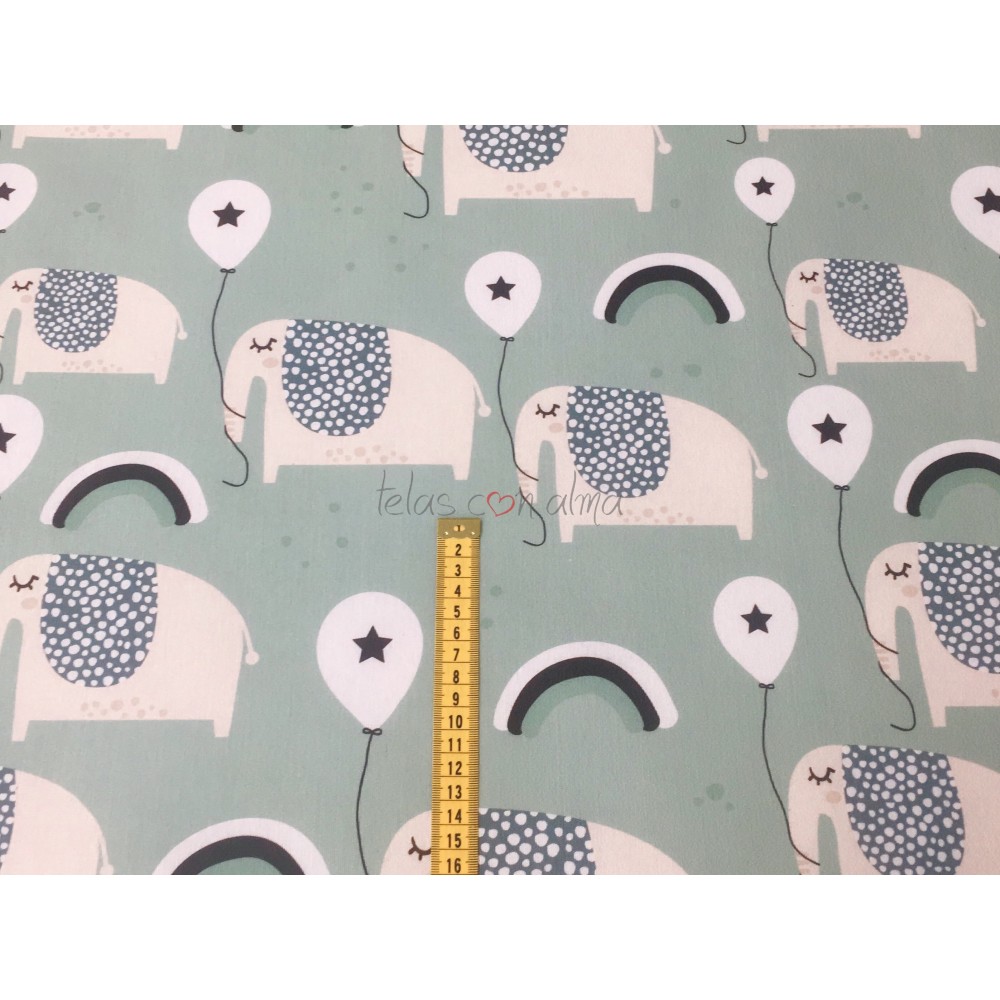 Tela de loneta con motivos de elefantes, ideal para la confección de todo tipo de ropa de hogar, así como para la confección de vestuario de mujer, hombre, niño y bebé.