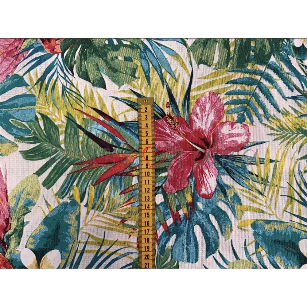 Tela de loneta con motivos de hojas y flores, ideal para la confección de todo tipo de ropa de hogar, así como para la confección de ropa de hombre mujer, niño y bebé.
