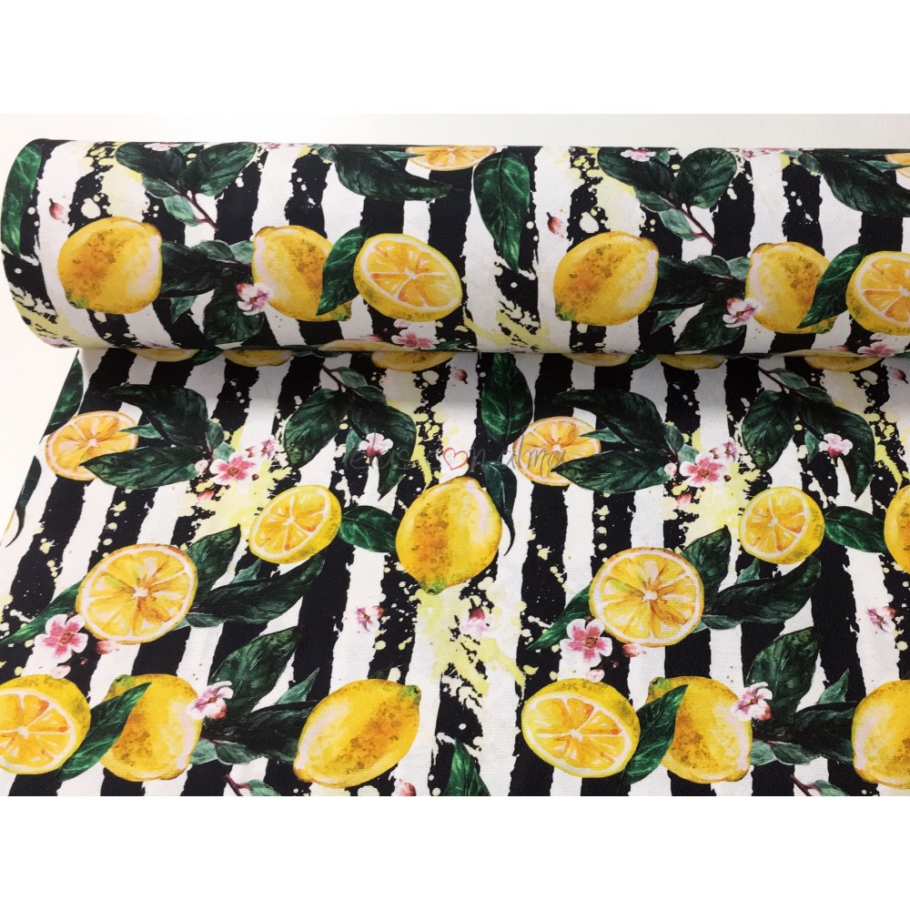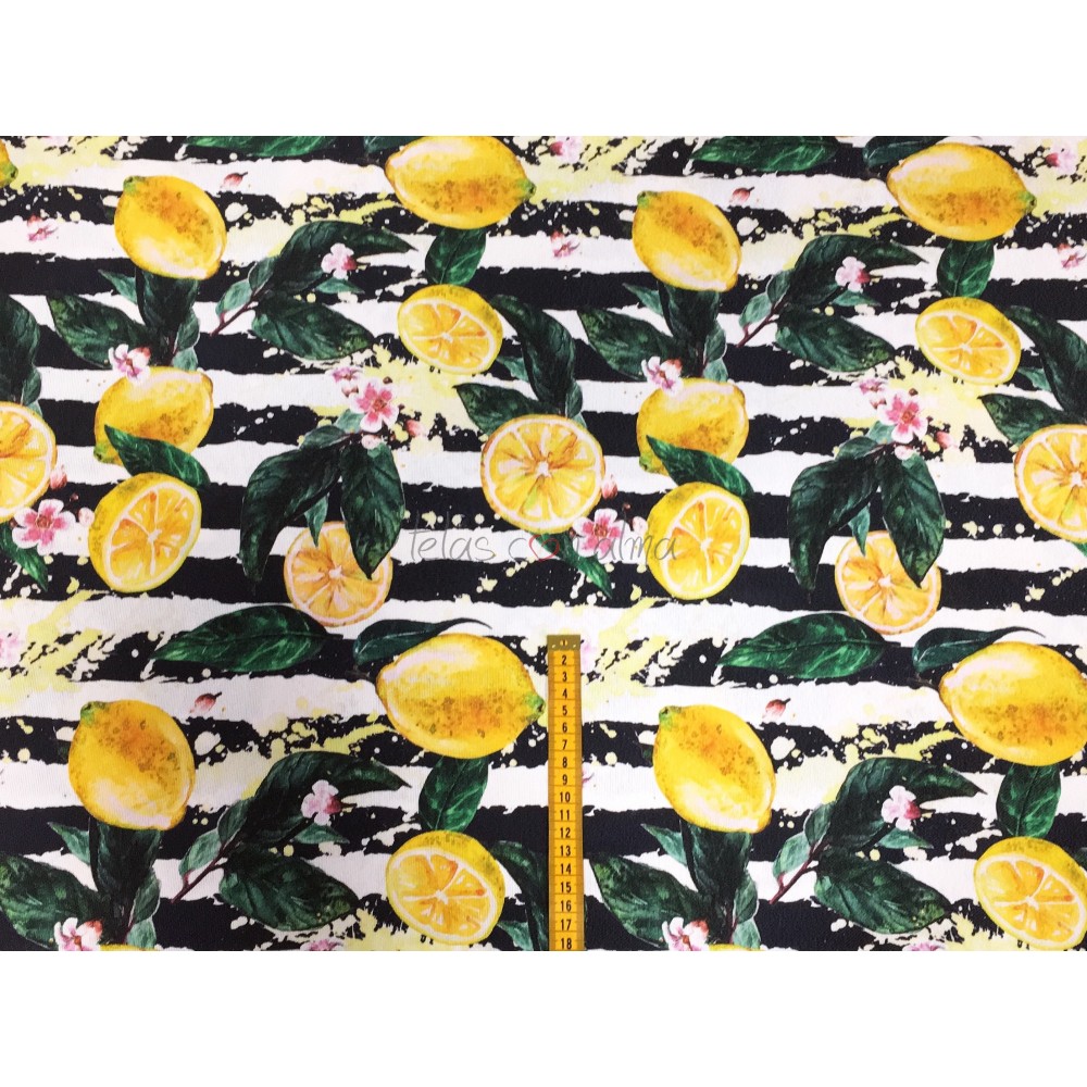 Tela de loneta con motivos de limones, ideal para la confección de todo tipo de ropa de hogar, así como para la confección de vestuario de mujer, hombre, niño y bebé.