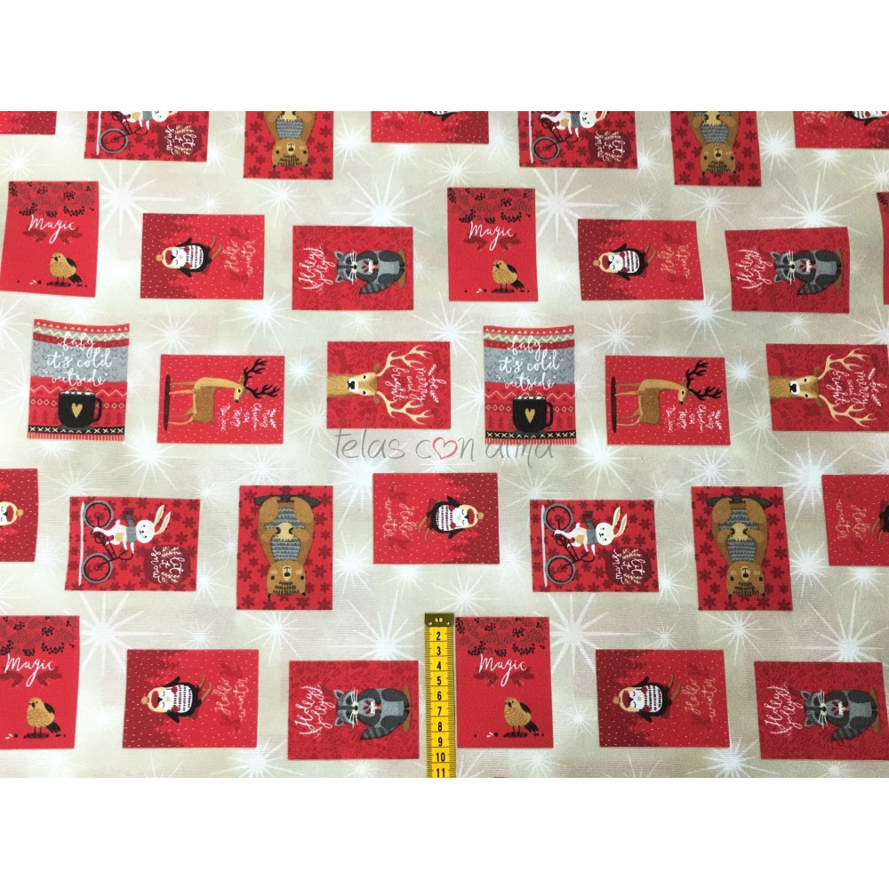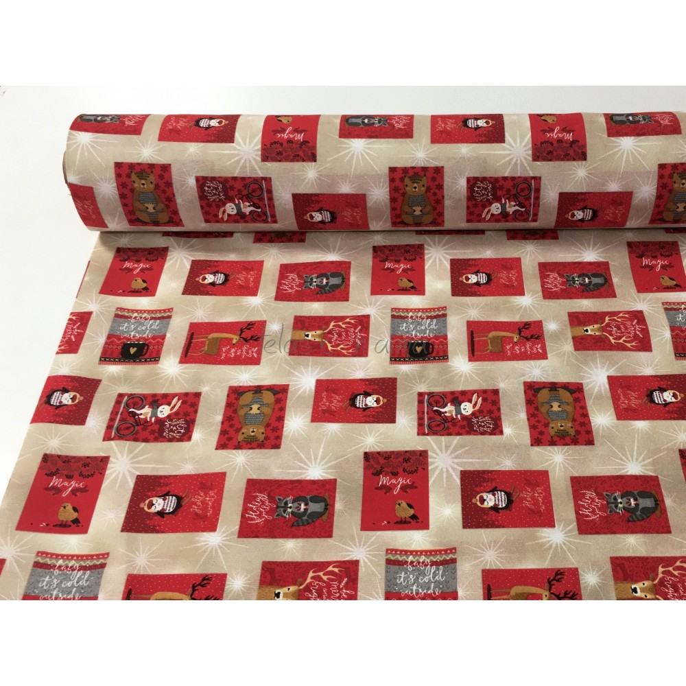 Tela de loneta con motivos navideños. Ideal para la confección de todo tipo de ropa de hogar como: mantelerías, servilletas, cojines o camino de mesa entre otros.