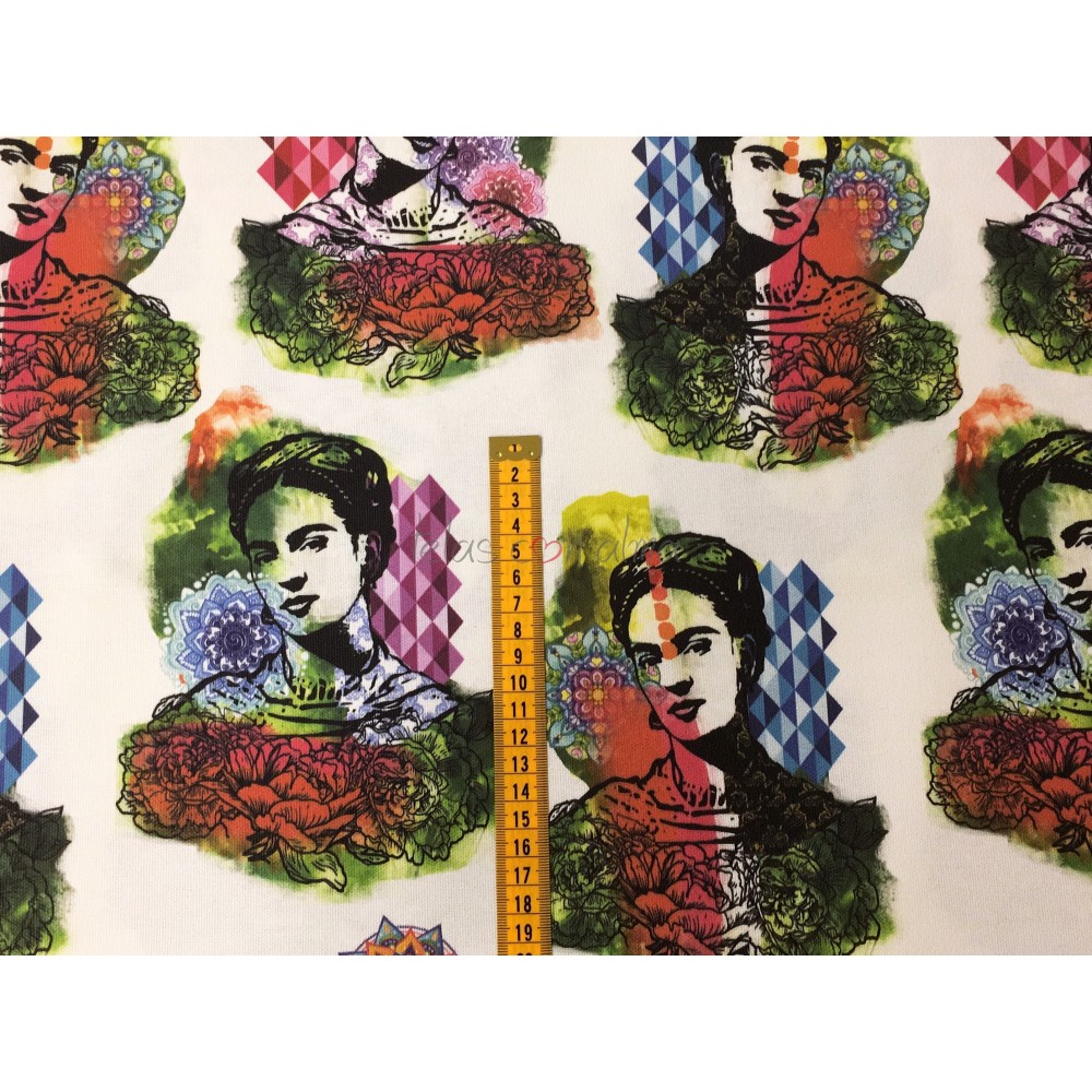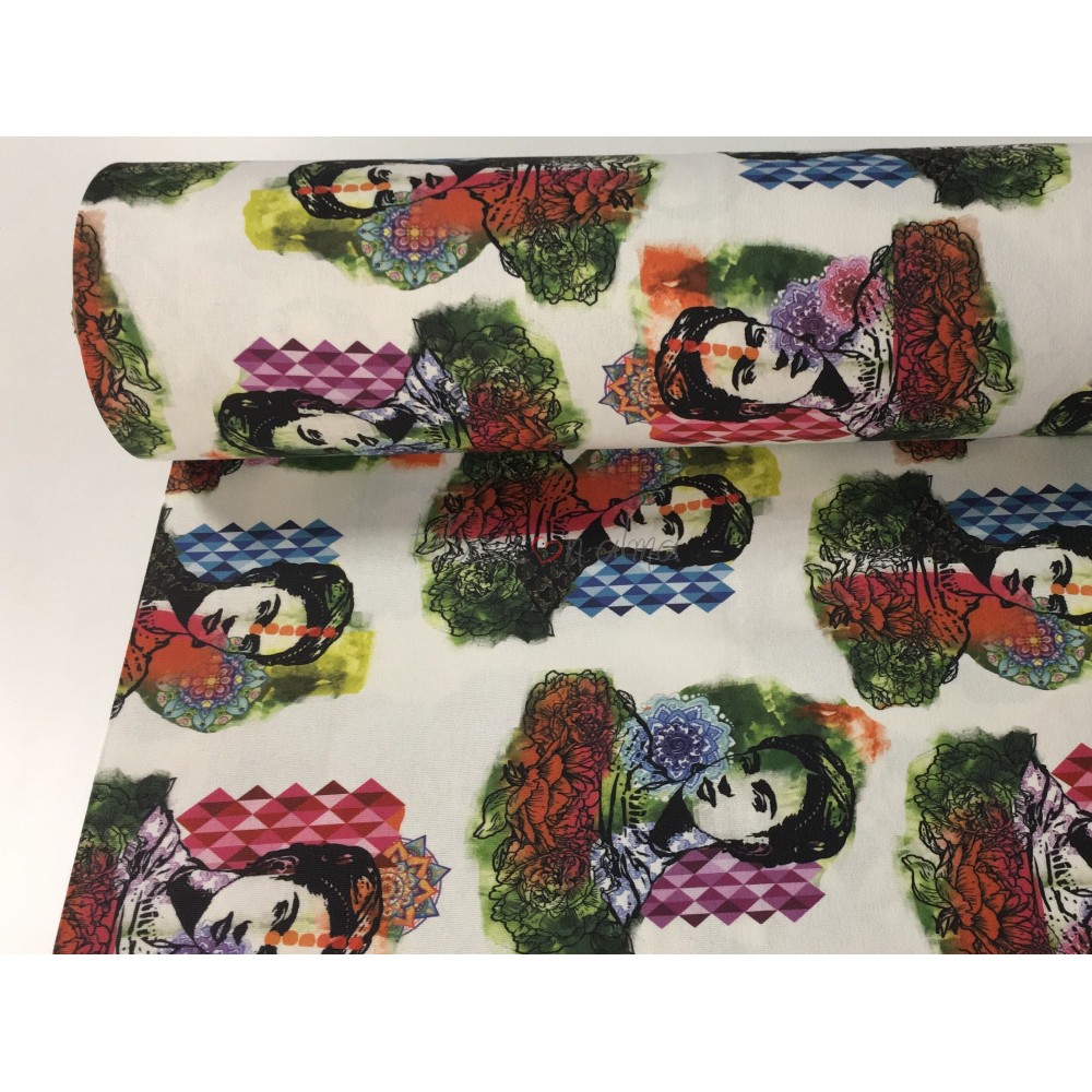 Tela de loneta con motivos de Frida Kahlo, ideal para la confección de todo tipo de ropa de hogar, así como para la confección de vestuario de mujer, hombre, niño y bebé.