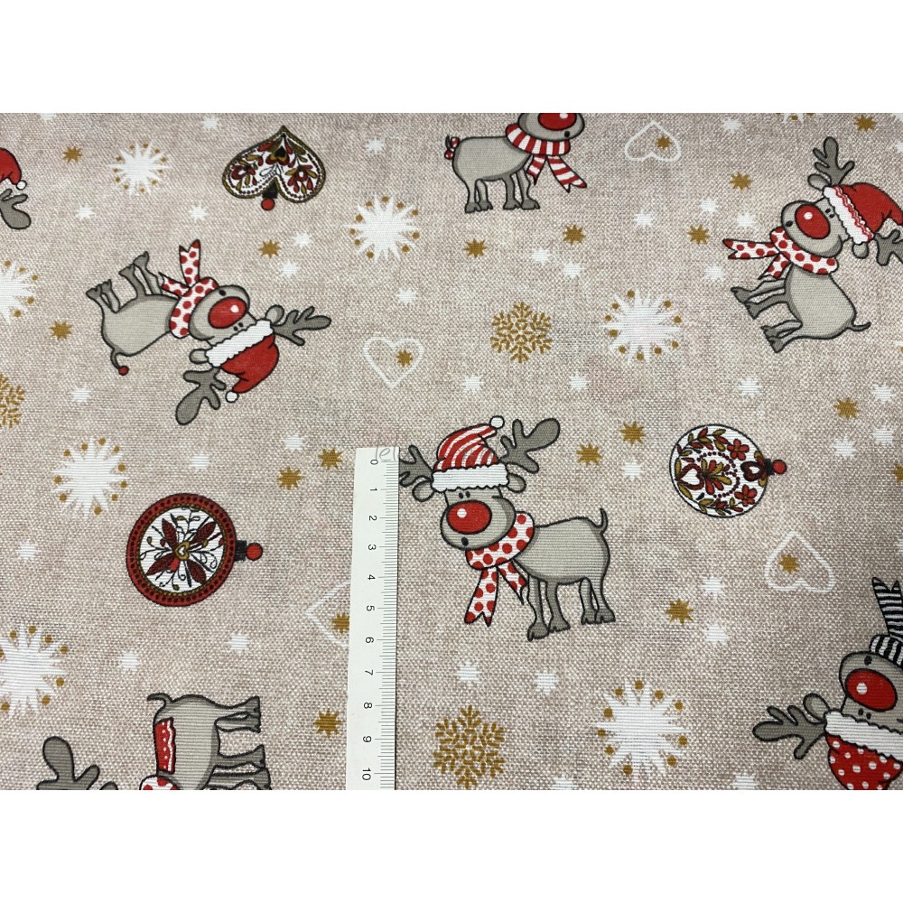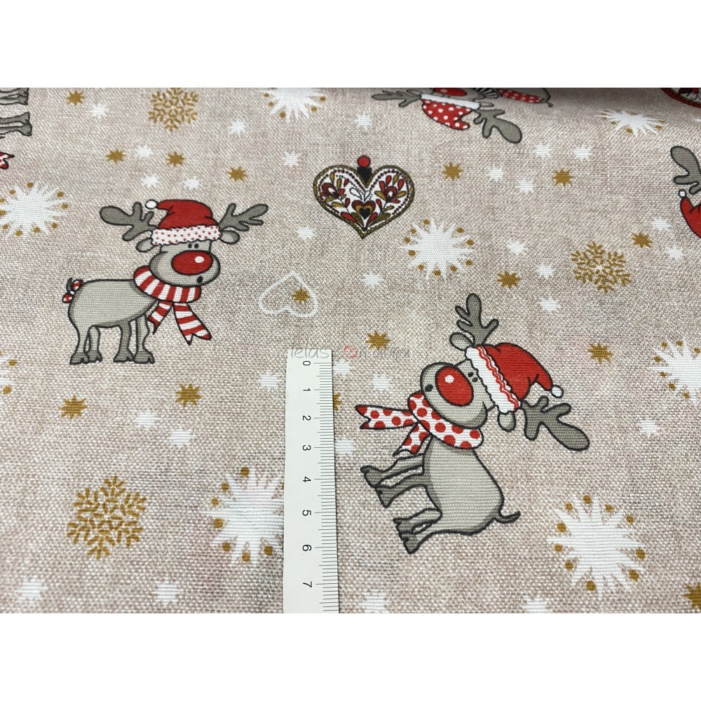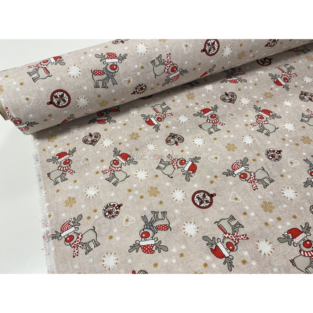 Tela de loneta con motivos navideños. Ideal para la confección de todo tipo de ropa de hogar como: mantelerías, servilletas, cojines o camino de mesa entre otros.