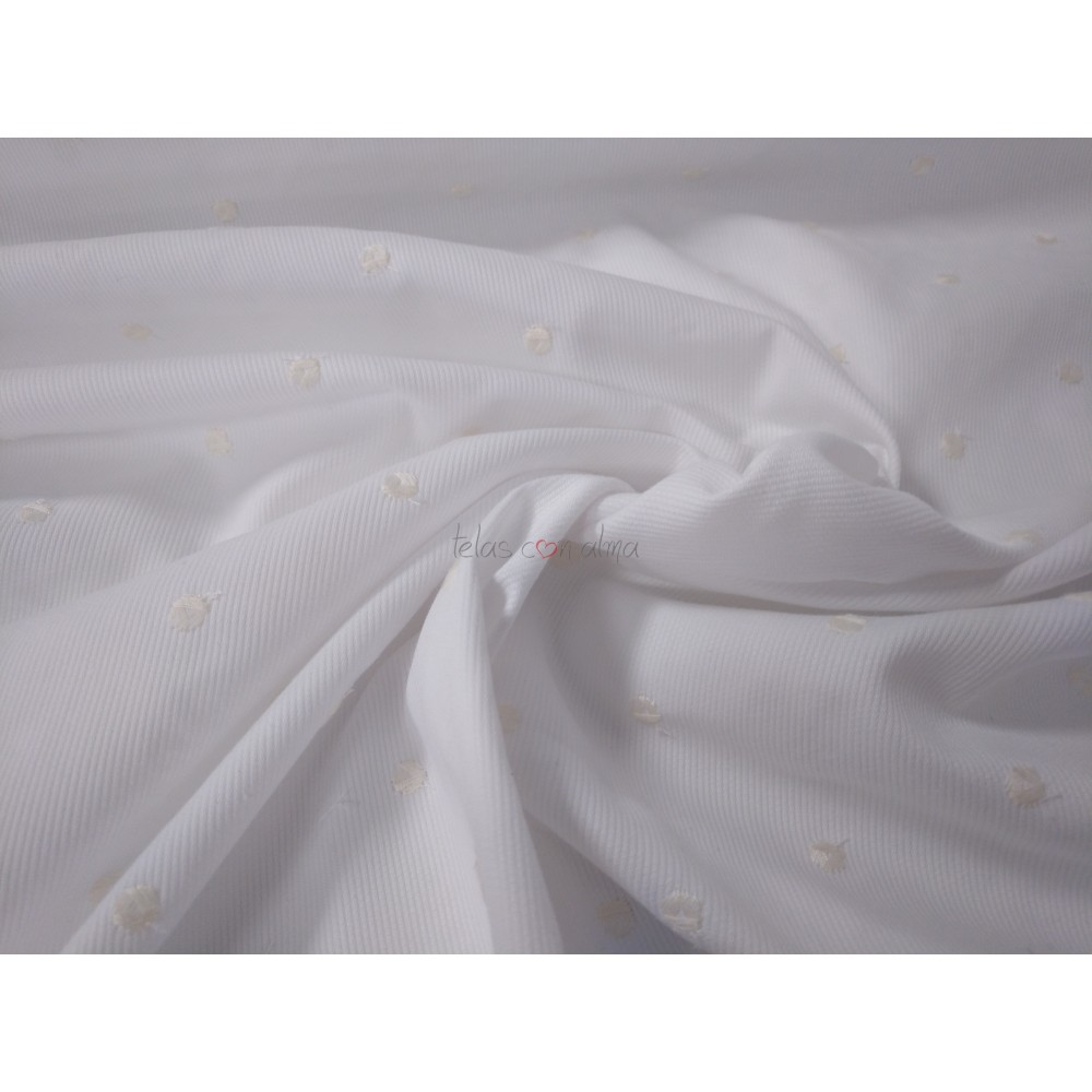 Piqué de canutillo blanco con topos bordados en crudo. Puede utilizarse para vestido, ranita y cubre de bebé, además para complementos infantiles como babero, arrullo...