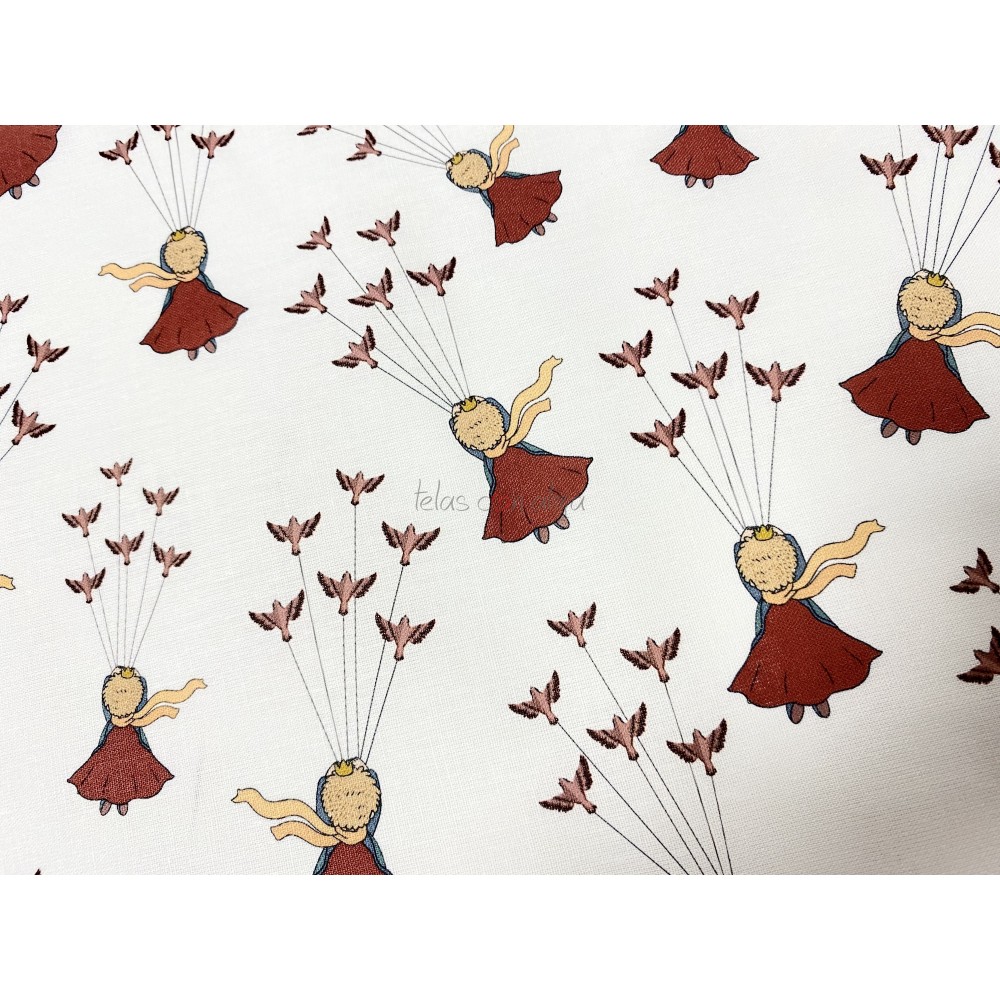 Estampado de El Principito de espaldas, volando con su capa y su bufanda tirado por pájaros.