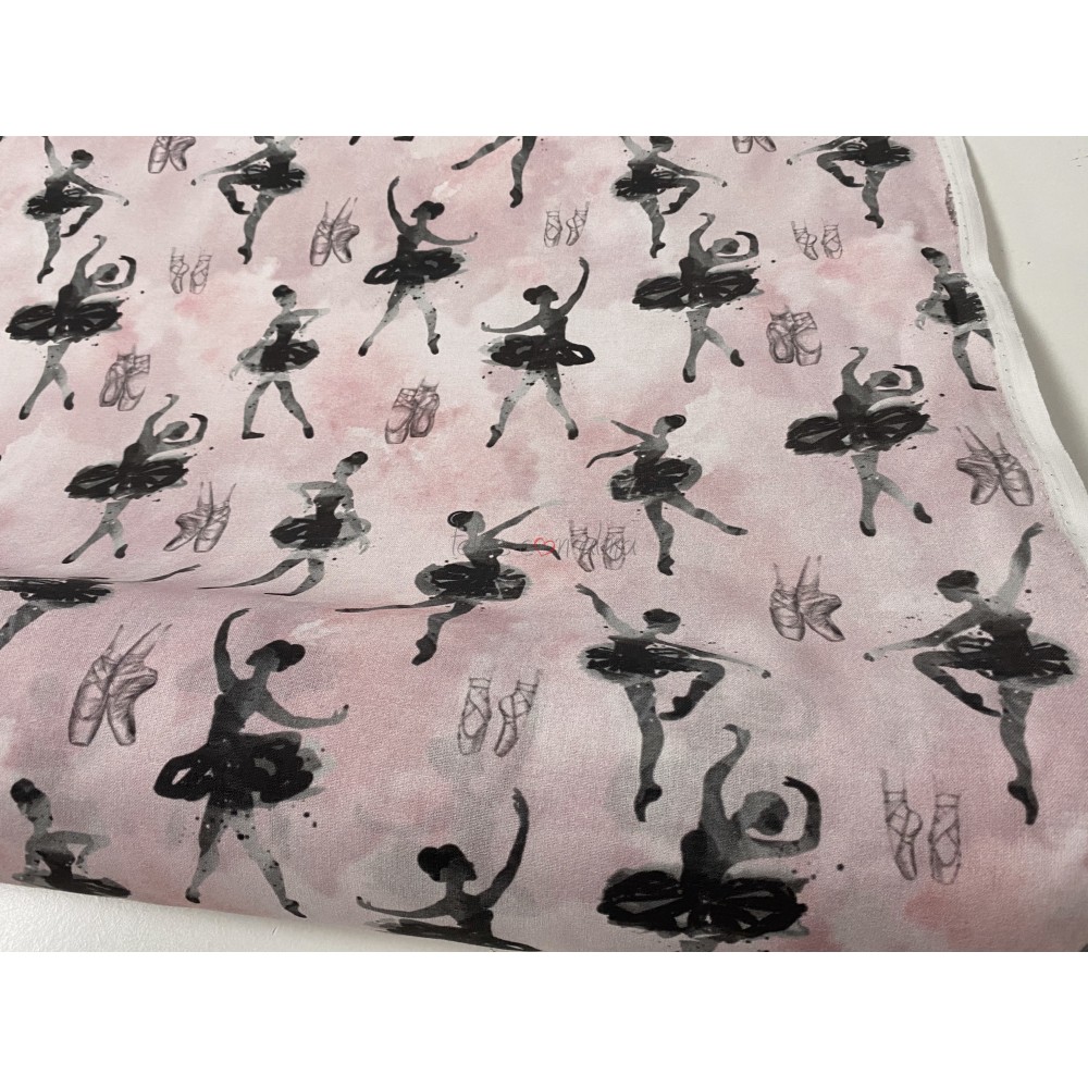 Popelín de algodón con fondo en rosa empolvado degradado, y bailarinas y puntas en tonos grises.